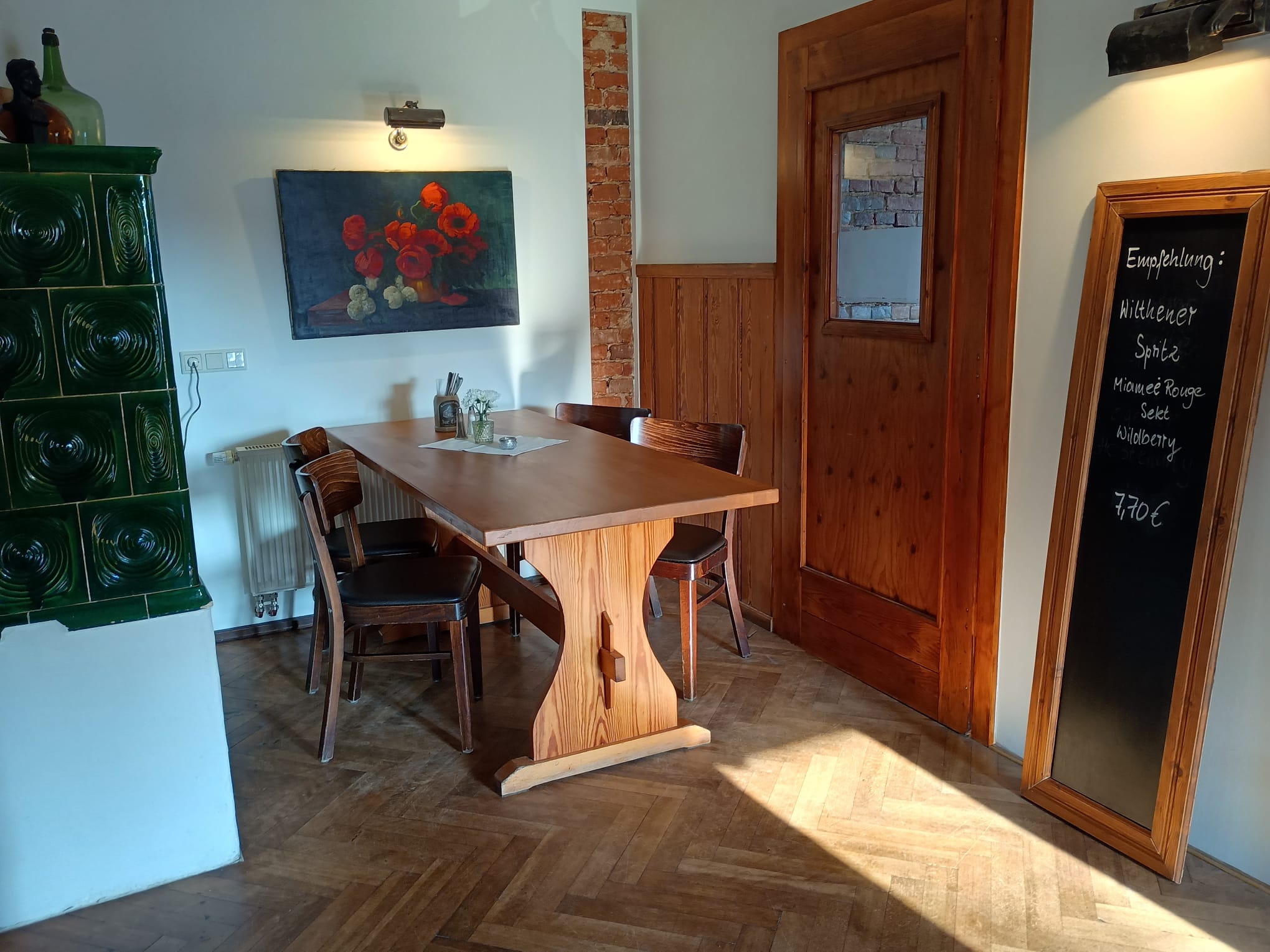 Dieser Tisch bietet Platz für max. 7 Personen und liegt abseits der anderen Räumlichkeiten, jedoch mit direktem Zugang zur Terrasse und Biergarten.
