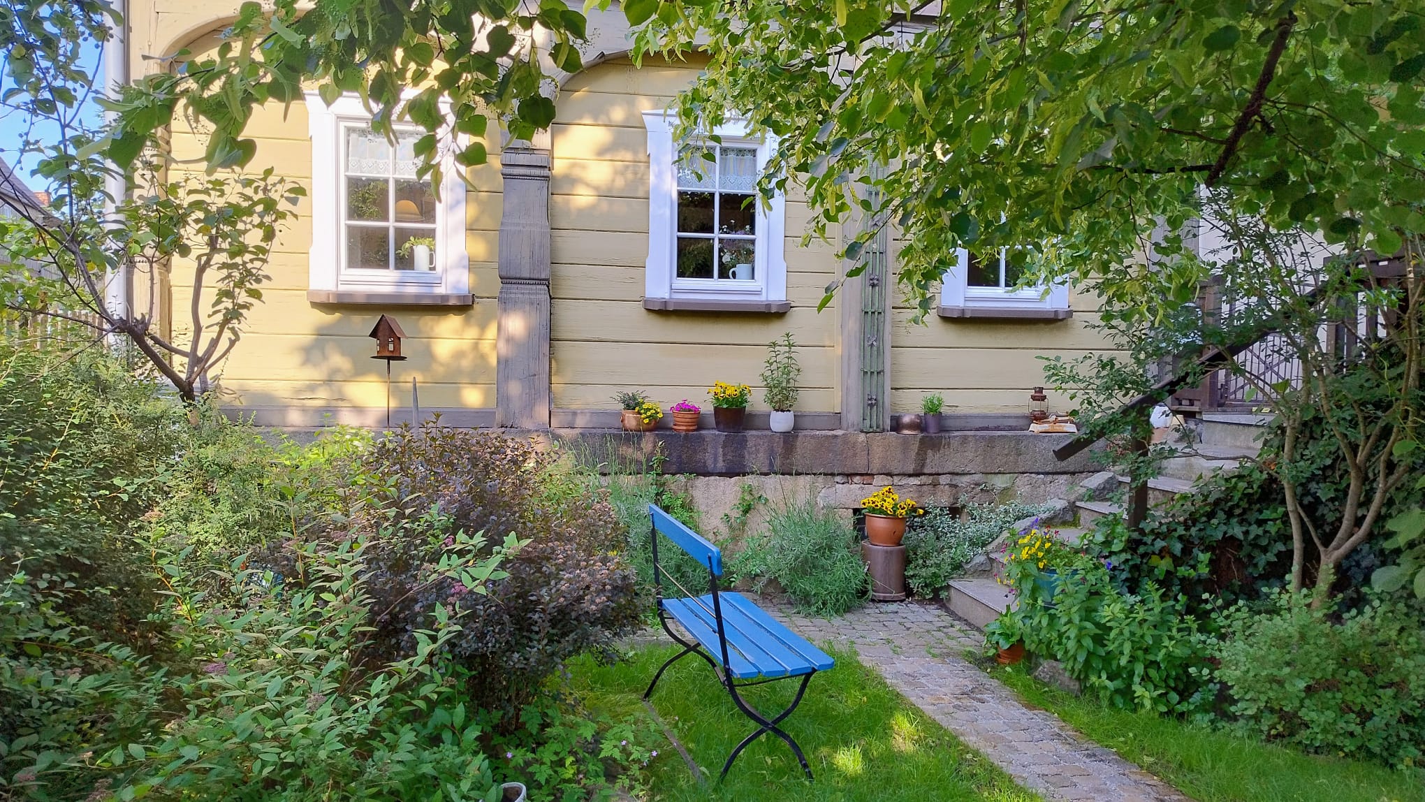Von unserer überdachten Terrasse haben Sie einen wunderschönen Anblick auf das denkmalgeschützte Ensemble am St. Barbara Markt bestehend aus dem Rittergut, Villa Hünlich und der Wilthener Weinbrennerei.